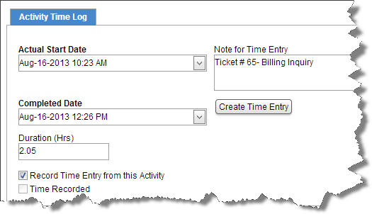 When you are finished with the activity, click the dropdown arrow on the Completed Date and NEXT will automatically enter the ending date and time. Again, you are able to adjust this date/time as needed. Make sure to check the box “Record Time Entry from this Activity.”