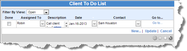 On the “Client To Do List” Section the user can choose to add a new “To Do.” This can be assigned to the logged in user or another user in the database.