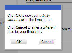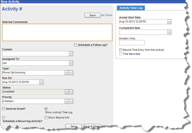 The user will enter the details for the activity and the amount of time spent on the task. The Internal Comments are for company use and should be a recap of the conversation or activity that you had with the client / prospect. (When you click “Record Time entry for this Activity” you will have the option to enter a different note for your time entry which will transfer to the invoice, should you not want those internal notes on the invoice.