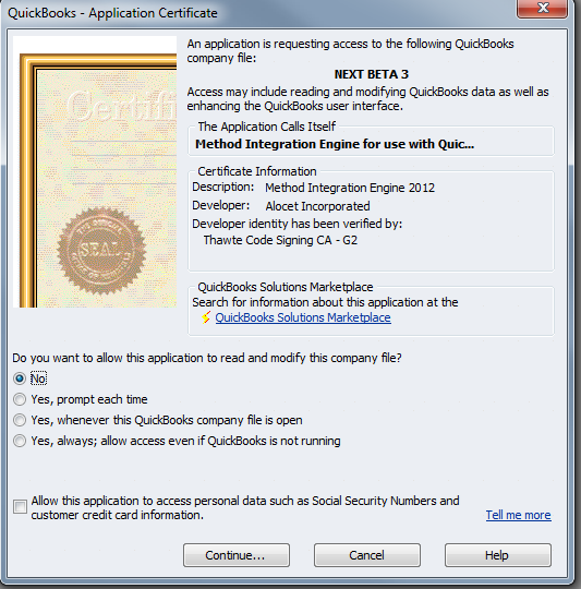 At the Application Certificate pop up, click on the “Yes, always; allow access if Quick Books is not running” radio button.