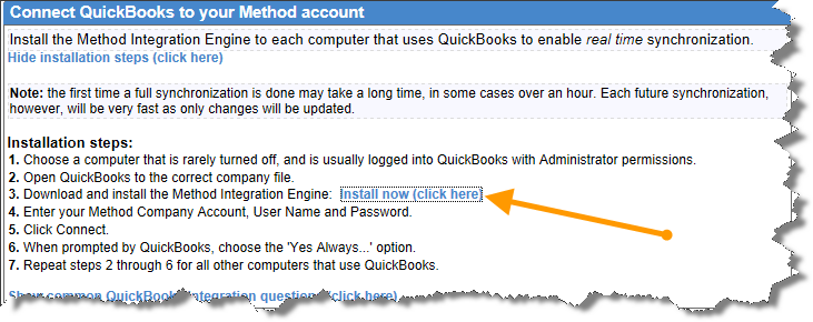 At the “Connect QuickBooks to your Method account” popup, click on “Install now (click here).”