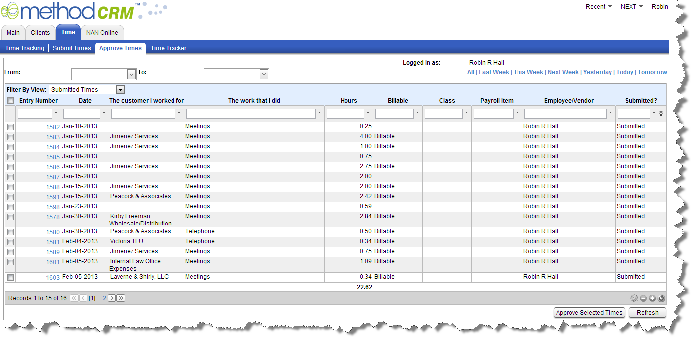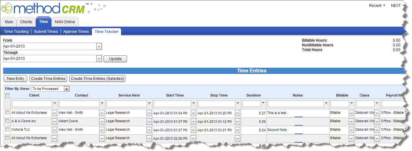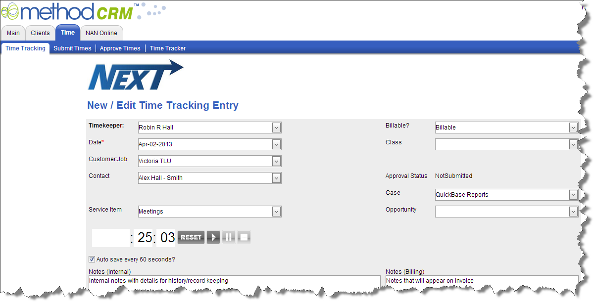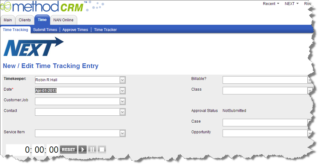 If a user needs to enter time, from the NEXT Desktop they will click the “Enter Time” button, which will bring up the “New / Edit Time Tracking Entry” screen.