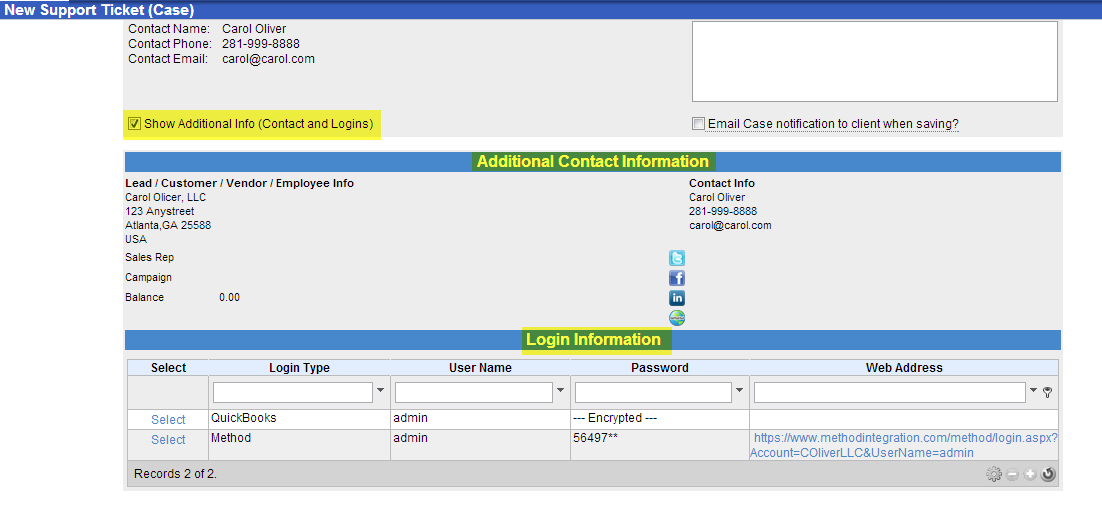 Click the checkbox next to Show Additional Info (Contacts and Logins) if you need to see Additional Contact Information or Logins you may have saved for this particular client.