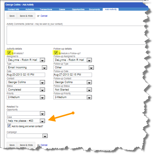 If this activity is associated or related to a Case (Support Ticket) , then you can choose the case from the drop down list. The drop down list will only show the cases associated with the customer that you are linked to.