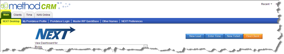 If you are going to have NEXT be your primary CRM (which you should), then you can change your user set up to have NEXT be the default tab group that is displayed when signing into Method.